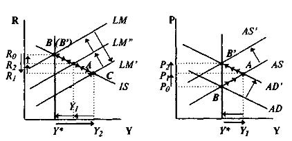 Увеличение предложения денег сдвигает кривую LM вправо до положения LM', что отражает рост совокупного спроса AD до AD'. Сдвиг AD сопровождается инфляцией спроса - цены увеличиваются с Р1 до Р2. Это относительно сокращает реальное денежное предложение и кривая LM' смещается назад влево до положения LM". В точке А устанавливается краткосрочное макроэкономическое равновесие.