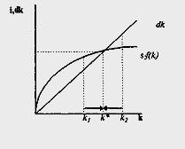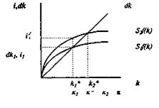 Равновесие является устойчивым, поскольку независимо от исходного значения k экономика будет стремиться к равновесному состоянию, т.е. к k*. Если начальное ниже k*, то валовые инвестиции (s-f(k)) будут больше выбытия (dk) и запас капитала будет возрастать на величину чистых инвестиций. Если k2> k*, это означает, что инвестиции меньше, чем износ, а значит запас капитала будет сокращаться, приближаясь к уровню k * (см.рис. 8.2.2.).