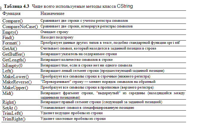 Едва ли найдется программа, в которой не обрабатывались бы тем или иным образом текстовые строки К сожалению, сам по себе язык C++ не имеет мощного встроенного механизма работы с данными такого типа, что позволяет некоторым программистам говорить о его "недоразвитости" по сравнению с PASCAL или BASIC. Встроенный в MFC класс CStn ng переводит подобные рассуждения в разряд злопыхательских инсинуаций. Методы этого класса ни в чем не уступают аналогичным средствам других языков. В табл. 4.3 перечислены чаще всего употребляемые методы этого класса.