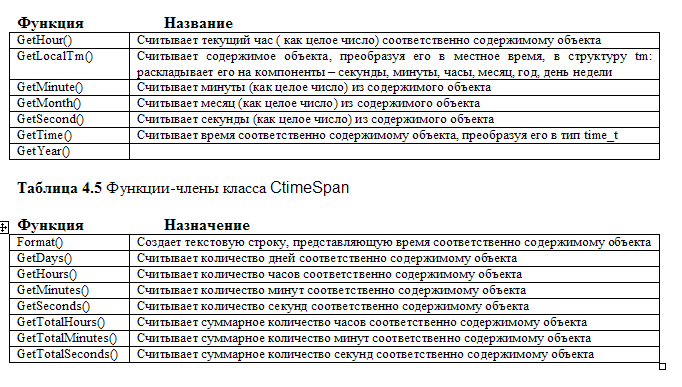 Если вам приходилось программировать обработку данных, связанных с текущим временем, которые можно получить с компьютера, вас, несомненно, порадует наличие в MFC таких классов, как CTime и CTimeSpan. Они представляют соответственно абсолютное и относительное (elapsed) время. Использование этих классов настолько очевидно, что мы даже отказались от специального примера в данном разделе. Тем не менее определенные начальные сведения об этих полезных классах вы из него почерпнете. Прежде чем приступить к самостоятельным экспериментам с классами времени, взгляните на табл. Е.5, в которой перечислены методы класса Ctime, и на аналогичную таблицу для класса СТimeSpan (табл.4.4).