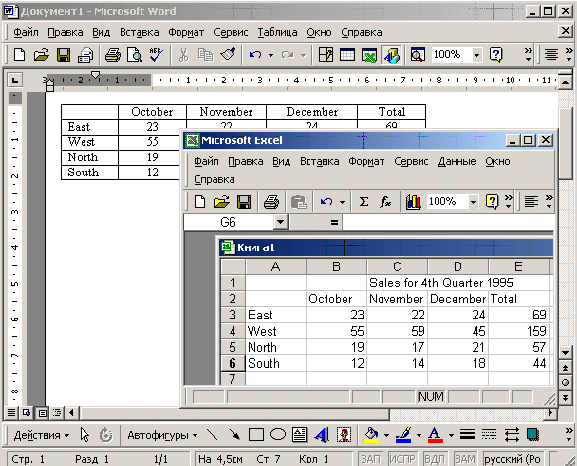 Другой способ внедрить часть одного документа в другой — использовать технологию перетащить и опустить. Эта технология работает в самых различных контекстах. Вы делаете щелчок на чем-либо (на пиктограмме, на выделенном блоке текста, выбранном элементе списка) и, удерживая кнопку мыши в нажатом состоянии, выполняете перемещение объекта. То, на чем бьш сделан щелчок, перемещается вслед за указателем мыши, а после того как вы отпустите ее кнопку, фиксируется в новой позиции. Это действие интуитивно понятно и логично, как изменение размера или перемещение диалоговых окон, но теперь область применения этой технологии стала намного шире. Например, вот как выглядит тот же самый обмен данными между Word и Excel, выполняемый с помощью технологии перетащить и опустить.
