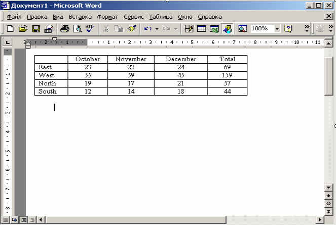 Внедрение подобно связыванию, но при внедрении создается копия объекта, которая и помещается в составной документ. Если в дальнейшем откорректировать исходный файл, изменения не будут отражены в составном документе. По внешнему виду диаграммы Excel в составном документе Word нельзя определить, связан этот объект с документом или внедрен в него. На рис. 3.5 показана электронная таблица Excel, внедренная в документ Word.
