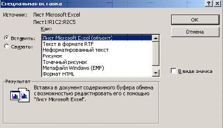 Рис. 3.7. Диалоговое окно Paste Special используется для связывания или внедрения выделенной части документа