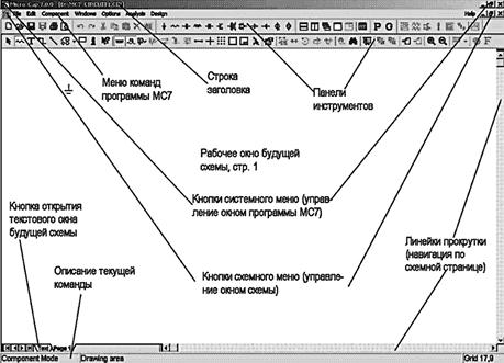 MicroCAP-7 является программой с многооконным графическим интерфейсом, позволяющим строить и редактировать схемы, модели и изображения компонентов, а также представлять результаты расчетов в удобном графическом виде. Для работы с этой программой необходимо использовать манипулятор «мышь». При помощи мыши можно менять расположение и размер окон, а также выбирать команды меню. Одновременно можно редактировать несколько схемных файлов, размещенных в разных окнах.