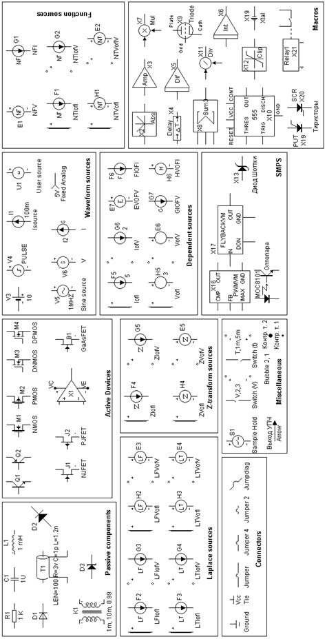 Меню COMPONENT содержит каталог библиотек аналоговых и цифровых компонентов. Он имеет систему разворачивающихся иерархических меню, открывающихся при наведении на них курсора мышью. В основном названия компонентов понятны из наименования на английском языке, однако ниже приведен список основных компонентов на русском для лучшей ориентации в программном пакете: