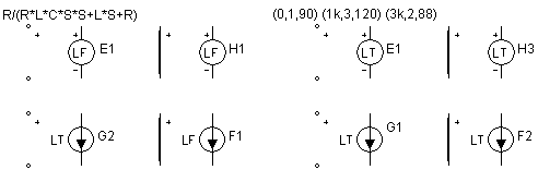 Для источников типа LFIofV, LFIofl, LFVofV и LFVofl в качестве параметра задается формула передаточной функции комплексной переменной S. Например:
