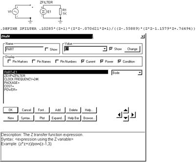 Примеры моделирования цифровых фильтров приведены в схемных файлах Z-TRANSFORM SOURCE_01… Z-TRANSFORM SOURCE_04 из каталога COMPONENTS\SOURCES_ИСТОЧНИКИ.