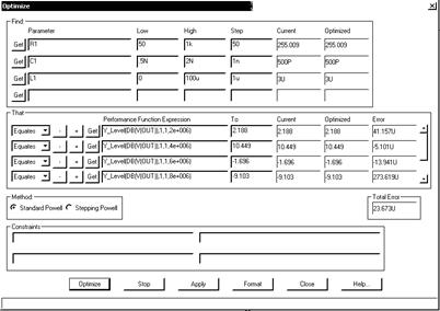 В приведенном примере требуется изменением L1, C1, R1 добиться такого вида АЧХ, чтобы она максимально близко проходила возле 6 заданных точек (частота, амплитуда в дБ): (2e6, 2.188), (4e6, 10.449), (6e6,-1.696), (8e6,-9.103), (10e6, -13.939), (20e6,-27.134). Это означает, что корень квадратный из суммы квадратов отклонений полученной АЧХ от заданных значений в заданных точках принимает минимальное значение. В соответствии с заданной целевой функцией и заполняются поля группы THAT в окне OPTIMIZE (см. рис. 4.18, 4.19). Например Y_Level(DB(V(OUT)),1,1,2e+006) обозначает значение кривой оптимизируемой характеристики (АЧХ в дБ) при значении независимой переменной (частоты) равной 2E6 Hz. Выбор Equates означает, что оптимизация идет для наилучшего удовлетворения условию равества коэффициента передачи в дБ заданному значению 2.188.