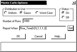 В диалоговом окне Monte Carlo Options (рис. 4.21, а), открываемом по команде Monte Carlo/Options, указывается количество статистических испытаний Number of Runs (не более 30000) и характер закона распределения случайных параметров, заданных значением LOT параметра модели: Uniform равномерное распределение, Gauss — гауссово, Worst Case — наихудший случай. Напомним, что в окне Global Settings задается отношение разброса случайных параметров к среднеквадратическому отклонению SD.