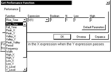 Rise_Time(Y_expr,Boolean_expr,N,low,high) — длительность возрастания вдоль оси X переменной Y от указанного нижнего (Low) до указанного верхнего (High) уровней при выполнении заданного логического выражения Boolean_expr.