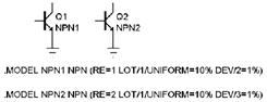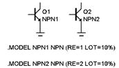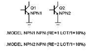 Во втором примере параметр BF имеет некоррелированный разброс DEV=20% и, кроме того, разброс LOT = 5%, коррелированный с изменением параметра IS.