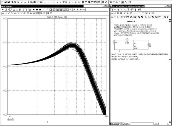 Результаты статистической обработки заносятся также в текстовый файл после выбора подкоманды Monte Carlo/Statistics. Текстовая информация размещается в файлах, имеющих то же имя, что и имя схемы, и расширения имени.АМС,.DMC,.ТМС в зависимости от вида анализа. Примеры статистического анализа см. в схемных файлах CARLO, CARL02, CARLO4 подкаталога Analysis\Monte Carlo.