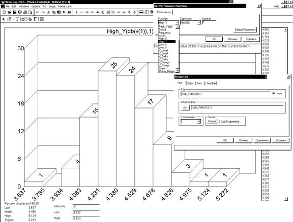 Статистическая обработка результатов моделирования производится по команде Monte Carlo/Histograms/Add Histograms. Ее результаты представляются в виде гистограммы, примерный вид которой показан на рис. 4.24. Двойной щелчок курсором мыши, расположенном в окне гистограмм, открывается диалоговое окно задания параметров Properties (закладка Plot), оно же открывается в начале выполнения команды Add Histograms. В нем в строке Function (вызываемой нажатием клавиши GET) указывается имя анализируемой функции F, а в строке Expression — имя характеристики цепи у (см. рис. 4.24).