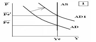 при увеличении AD уровень цен увеличивается, объем производства не изменяется и равен потенциальному.