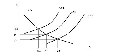 Изменение совокупного предложения показано на рис. 2.6. Уменьшается совокупное предложение, кривая AS сдвигается влево АS1, возникает инфляция, вызванная ростом издержек, и сокращается реальный ВВП. Если совокупное предложение увеличивается, кривая AS смещается вправо AS2, что приводит к росту реального национального продукта и снижению уровня цен.