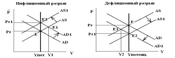 Если кривая совокупного спроса AD сдвигается влево (рост налогов) AD1, то Y2 меньше Y потенциального, возникнет дефляционный разрыв (рис. 2.7.б). Фирмы сокращают численность рабочих, снижают объем производства. Временное снижение цен приводит к временному повышению реального дохода (можно купить больше товаров и услуг). Уволенные работники согласятся работать за меньшую зарплату, что приведет к снижению издержек, поэтому совокупное предложение AS сдвинется вправо AS1 к Y потенциальному, но на другом уровне цен Ре1.