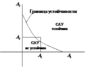 По коэффициентам характеристического уравнения определяются А1 и А2. Если точка оказалась ниже гиперболы – САУ устойчива, выше - неустойчива.