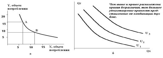 Предпочтения касаются всех благ, но для упрощения рассмотрим два блага х и у. На рис. 4.4 а показана кривая безразличия. Точки А (15 у, 7 х) и Б (8 у и 12 х) показывают комбинации потребления двух благ. Обе точки приносят одинаковую полезность для потребителя.