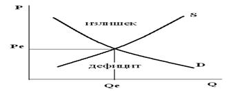 Равновесная цена Ре – это цена, уравновешивающая спрос и предложение в результате действия конкурентных сил, что приводит к равенству объемов спроса и объемов предложения в точке Е (рис.4.9) – равновесный объем или количество Qe.