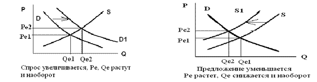 Например, увеличилось количество покупателей, товар вошел в моду, выросла цена на заменяющий продукт и т.п. все это приведет к росту спроса и сдвигу кривой вправо. Следовательно, равновесная цена Ре и равновесный объем Qe вырастут. Если вырастет доход потребителя, а товар относится к товару низшего порядка, то спрос снизится, кривая сдвинется влево, Ре и Qe сократятся.