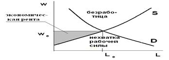 На конкурентных рынках рабочей силы заработная плата устанавливается как равновесие спроса и предложения, которое формируют наемные работники по различным категориям работников, по видам работ (рис. 8.2). В точке равновесия Е при ставке заработной платы We все, кто хочет работать, будут приняты фирмами на работу. Установление размера заработной платы выше равновесного We приводит к появлению безработицы, ниже равновесного We – к нехватке рабочей силы.