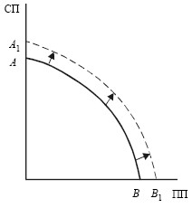 Рис. 4.2. Равномерный сдвиг кривой производственных возможностей