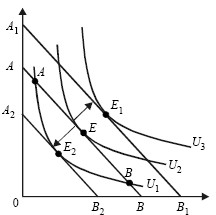AB, A1B1, A2B2 – бюджетные линии; E, E1, E2 – точки оптимума.