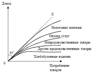 2. Кривые Энгеля. Зависимость между доходом и потреблением впервые исследовал немецкий статистик Х. Энгель, поэтому ее графическое отображение названо кривые Энгеля (рис. 13.2).
