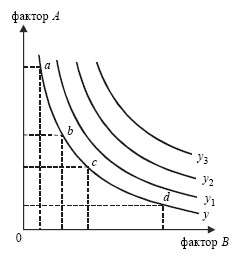 a,b,c,d – различные комбинации ;у y1,у2 у3 – изокванты продукта.