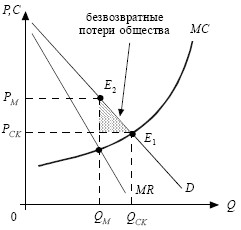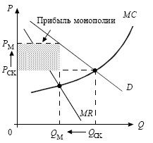 PCK – цена совершенной конкуренции; PM – цена монополии; QCR – объем производства при совершенной конкуренции; QM – объем производства при монополии.