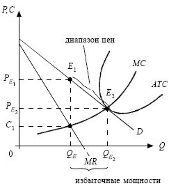 QE – равновесный объем товара на рынке; D – кривая спроса; MR – линия предельного продукта; ATC – средние общие издержки; MC – предельные издержки; PE1 – цена монополии; PE2 – цена совершенной конкуренции при «предельной» фирме.
