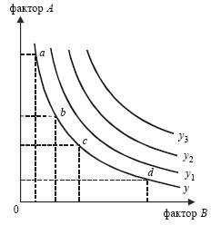 a, b, c, d – различные комбинации; y, y 1, y 2, y 3 – изокванты продукта.