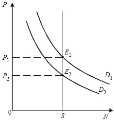 N – фактор «земля»; D 1, D 2 —спрос на землю; S – предложение земли; P 1, P 2 – цена земли (арендная плата); E 1, E 2 – равновесие спроса и предложения
