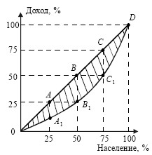 OABCD – линия гипотетического абсолютного равенства в распределении дохода;