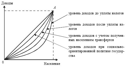 Рис. 33.2. Зависимость кривой Лоренца от социальной и налоговой политики государства