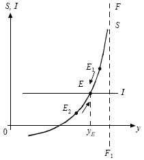 S – сбережения; I – инвестиции; у – объем национального производства (ВНП); FFX – линия потенциального производства в условиях полной занятости; yE– равновесный объем ВНП; E, E1, E2 – точки равновесия.