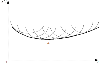 В долгосрочном периоде все ресурсы и, следовательно, все издержки становятся переменными. Объем производственных мощностей выбирается так, чтобы максимизировать прибыль, а это требует при каждом заданном объеме выпуска минимизации общих и средних издержек. Поэтому график функции долгосрочных средних издержек (АТС) показывает наименьшие средние издержки производства, при которых может быть обеспечен любой заданный объем производства фирмы.