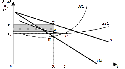 Оптимальный размер выпуска продукции определяется проекцией точки пересечения кривых предельного дохода и предельных издержек (точка H). Qm – выпуск продукции, максимизирующий прибыль монополии, при цене Рm. Совокупный доход при этом будет равен произведению оптимального выпуска на цену оптимального спроса, а максимальная прибыль равна разнице между совокупным доходом и полными издержками. Qс – объем продаж конкурирующей фирмы по цене Рс (рис. 4.11).