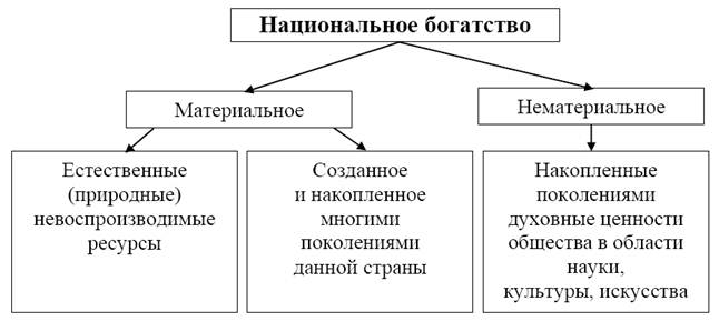 Функционирование национальной экономики (национального хозяйства) приводит к созданию и накоплению национального богатства страны, структура которого представлена на рис. 1.3.