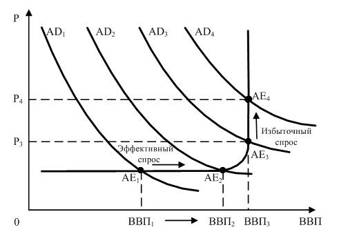 Увеличение спроса больше AD3 нежелательно, т.к. экономические ресурсы использованы полностью и рост спроса не приведет к увеличению объема национального производства, а спровоцирует лишь рост цен в экономике. Такой спрос называют избыточным, лишним, провоцирующим инфляцию.
