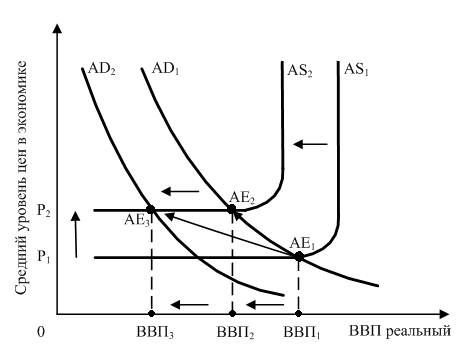 В экономике обычно изменяется не только спрос, но и предложение, поэтому их взаимосвязь более сложная. На рис. 3.9 представлена ситуация, когда в экономике имеет место экономический кризис, вследствие чего уменьшается и спрос и предложение. Равновесие достигается в точке AE3, которая характеризуется низким уровнем национального производства и одновременным ростом уровня цен.