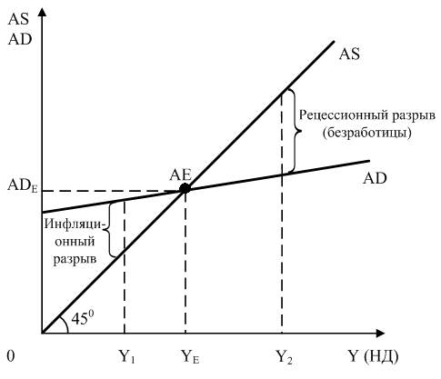 Макроэкономическое равновесие имеет место при равенстве совокупного спроса и совокупного предложения в точке АЕ. Если в экономике производится объем национального производства Y1, то это означает превышение совокупного спроса над предложением, следствием чего является неудовлетворенный спрос, который приводит к росту цен в экономике (инфляционный разрыв). Если в экономике производится объем национального производства Y2, то в экономике предложение превышает спрос и имеет место перепроизводство товаров, что провоцирует экономический кризис и безработицу (разрыв безработицы).