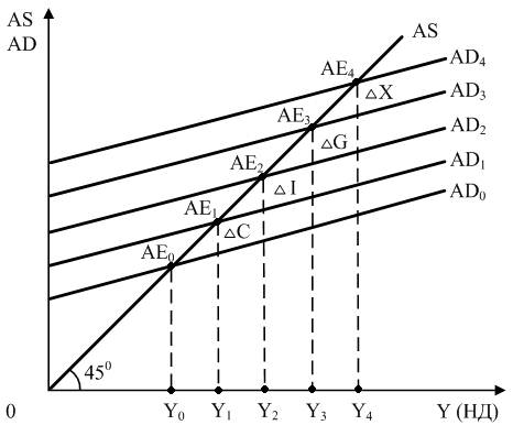 Следует особо отметить, что прирост объема национального производства (DY) вследствие мультипликационного эффекта больше, чем прирост того фактора, который вызывает рост объема производства. В экономической теории определяется несколько мультипликаторов: мультипликатор автономных потребительских расходов (Ка), инвестиционный мультипликатор (Кi), мультипликатор государственных расходов (КG), мультипликатор чистого экспорта (КX). Любой мультипликатор показывает во сколько раз быстрее увеличивается объем национального производства вследствие увеличения вызвавшего его фактора (D С, DI, D G, D X).