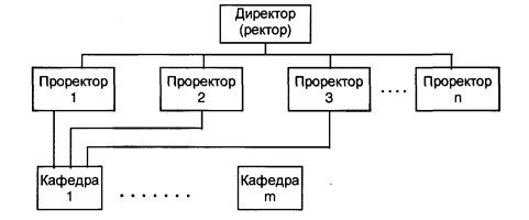 В матричной организации какой-либо деятельности структурная единица (кафедра) выполняет работу по ряду функций (учебный процесс, научный процесс, и т.д.). В этом случае, по каждой из функций такая структурная единица подчиняется различным управляющим органам вышележащих уровней.