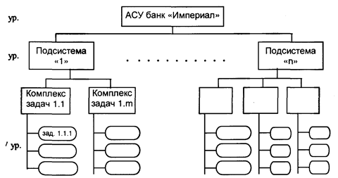 Как было сказано выше, функциональная структура АСУ есть синтез организационных и функциональных структур ОУ. Поэтому, внешне, схематично функциональная структура АСУ повторяет организационную структуру ОУ.В частности, АСУ банка в целом нужно генерировать директору банка. Обычно, функции заместителя директора воплощаются в отделах, подчинённых ему. Другими словами, каждый функциональный отдел имеет для себя функциональную подсистему, например «1»,...... «n».