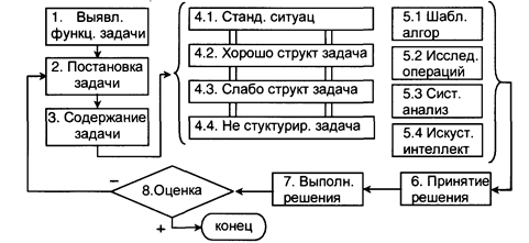 Если правильно был определён (по степени структуризованности) класс задач и математический метод её решения, то на основе анализа (8) выполнения решения либо заканчивается процедура, либо процесс возвращается к постановке задачи и содержанию задачи (если решение не удовлетворяет).