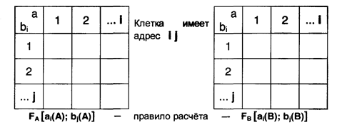 В этом случае входом (входные данные) являются две матрицы, которые оформлены в виде таблиц А и В. Каждая таблица имеет зоны, которые называются "шапка", где указаны конкретные реквизиты