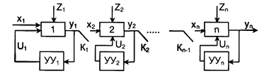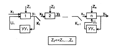 В этих системах, в отличие от первой, каждое звено имеет своё УУ и свою управляющую команду U. Выход каждого звена соединяется с последующим входом через разрыв цепи, то есть ключ К. Функционирование системы осуществляется следующим образом: пока в каждом звене (предыдущем) не будет скомпенсировано возмущение Z, сигнал с этого звена не поступает на последующее.