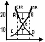 Если цена опустится ниже т.Е (СD) – спрос увеличится, а предложение уменьшится, возникает конкуренция между покупателями, цена будет расти и вернется к т.Е.