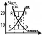Процентная ставка, соответствующая точке Е устроит и банк, и предпринимателя, поэтому кредит будет выдан под данную процентную ставку (равновесная процентная ставка).